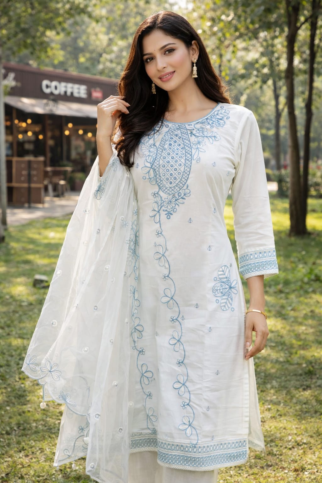 Ivory Embroidered Kurta Set with Sky Blue Threadwork & Sheer Dupatta
